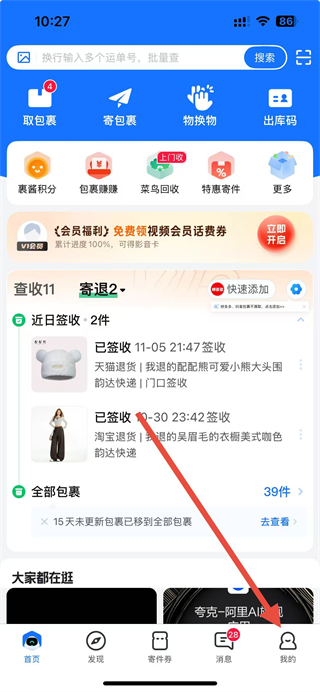 1、打開菜鳥裹裹app,在首頁點擊右下角我的選項,進(jìn)入個人頁面。