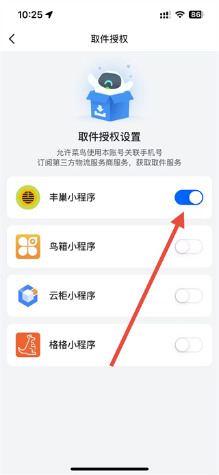 4、在取件授權(quán)頁面,點擊開啟豐巢小程序右側(cè)開關(guān)按鈕,即可完成豐巢柜取件授權(quán)。