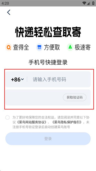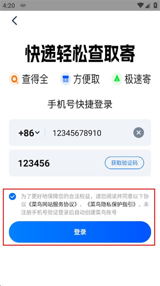 4、勾選同意協(xié)議手機(jī)號驗證登錄后自動創(chuàng)建菜鳥賬號,點擊登錄。