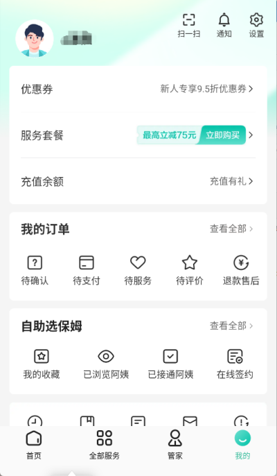 5、點擊我的選項能夠在里面看到自己的一些信息內(nèi)容,賬號的充值余額、訂單信息以及自助選保姆等功能。
