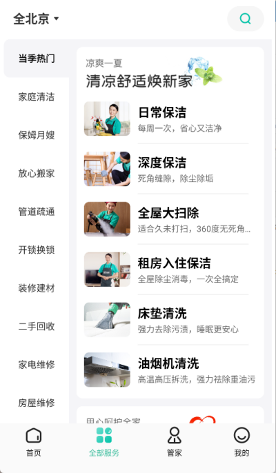 3、點擊下方的全部服務選項,可以查看支持的所有服務功能,并且對不同的服務進行里分類,分別有家庭清潔、保姆月嫂、放心搬家、管道疏通、開鎖換鎖等多個主要服務分類;