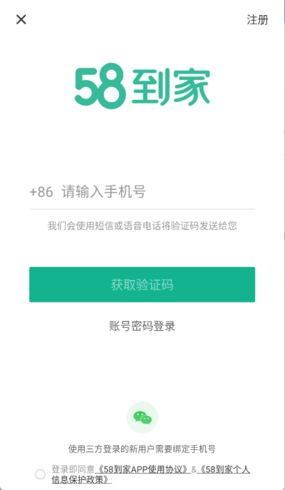 1、首先打開下載好的58到家APP,進入軟件后在登錄界面可以輸入自己的手機號進行登錄,輸入手機號后點擊獲取驗證碼選項即可;
