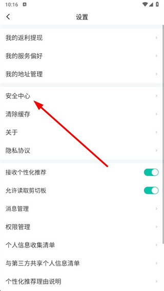 3、在設(shè)置頁面,點擊安全中心選項,進入賬號與安全頁面。