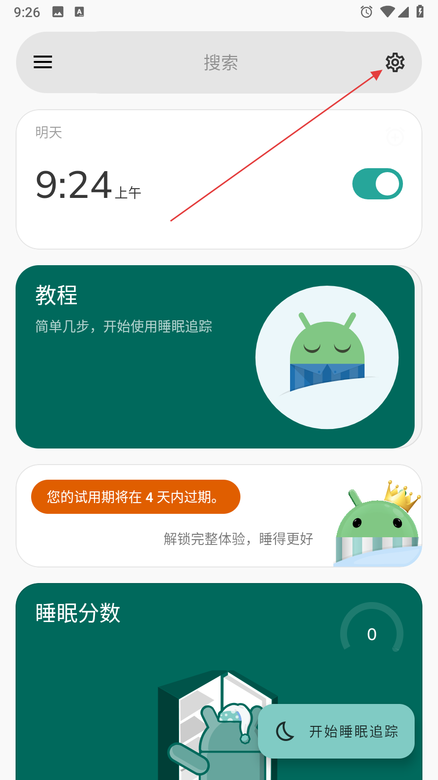 1、打開(kāi)睡眠追蹤APP,在首頁(yè)點(diǎn)擊右上角的設(shè)置圖標(biāo),進(jìn)入設(shè)置頁(yè)面。