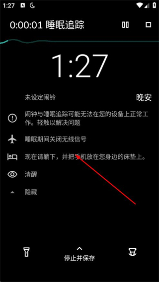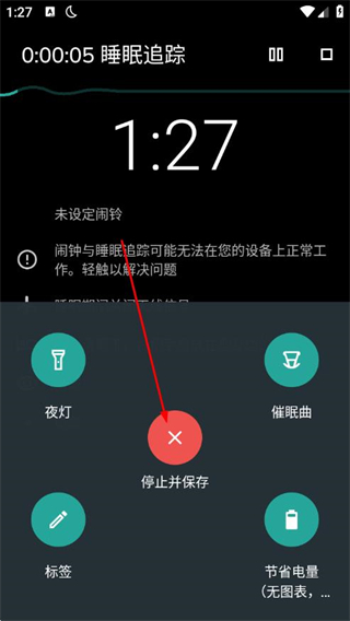 3、睡眠結(jié)束后,點(diǎn)擊停止并保存,即可完成睡眠追蹤并保存記錄。