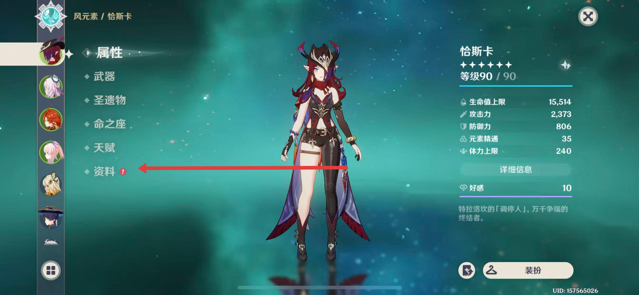 2、進入所選角色的界面后,點擊左側(cè)列表中的資料選項。