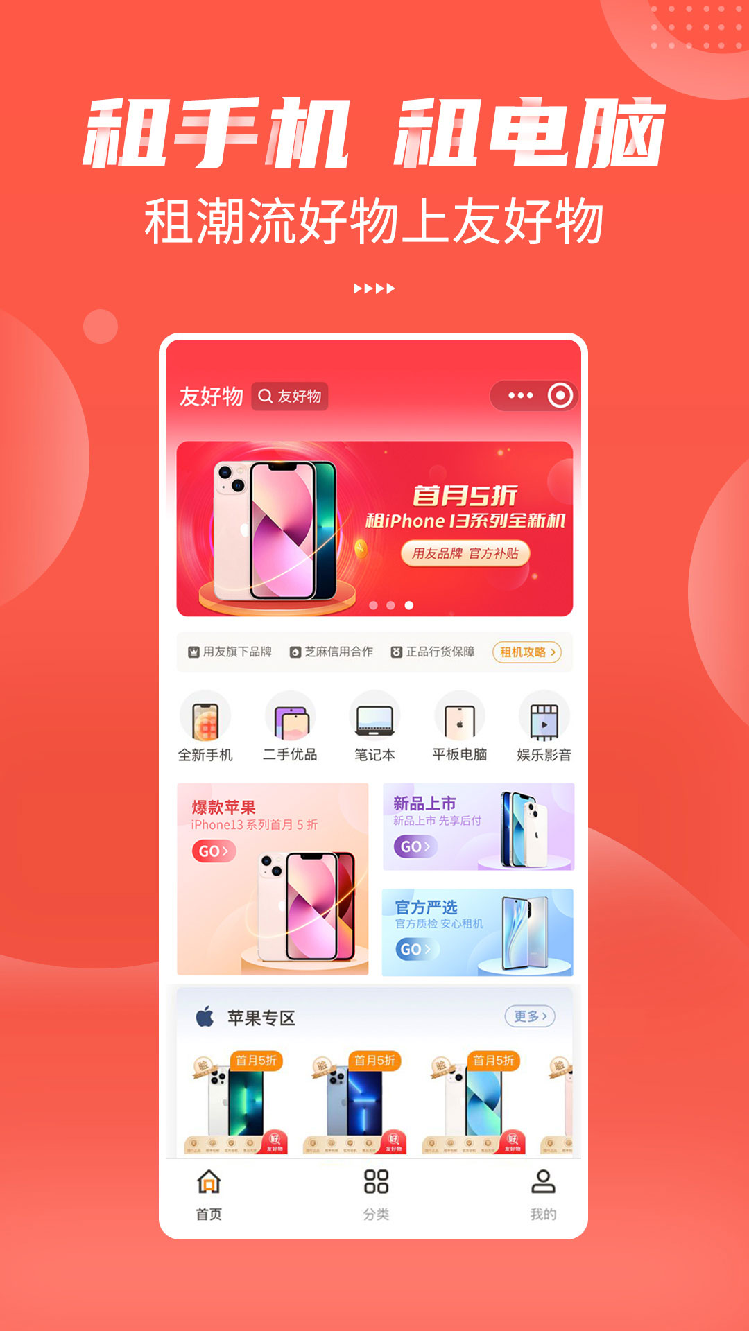 友好物租機(jī)秉承“以租代購、先享后付、共享共贏”的信用消費(fèi)新理念,服務(wù)年輕化、愛時(shí)尚、愛科技的優(yōu)質(zhì)用戶群體,不斷提升用戶在高端智能科技產(chǎn)品方面的體驗(yàn)感和便利度,是一款安全靠譜的租機(jī)平臺(tái),用友旗下品牌,支持多種電子設(shè)備,用戶可以放心租機(jī)。