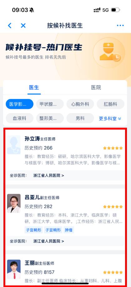 4、在按候補(bǔ)找醫(yī)生界面,瀏覽熱門醫(yī)生列表,選擇想掛號(hào)的醫(yī)生,點(diǎn)擊進(jìn)入詳情頁(yè),根據(jù)頁(yè)面提示完成掛號(hào)操作。
