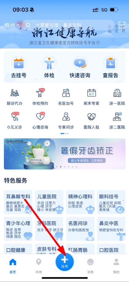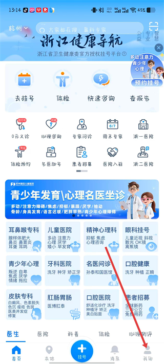 1、打開(kāi)浙江健康導(dǎo)航App,點(diǎn)擊底部導(dǎo)航欄中間的掛號(hào)按鈕。