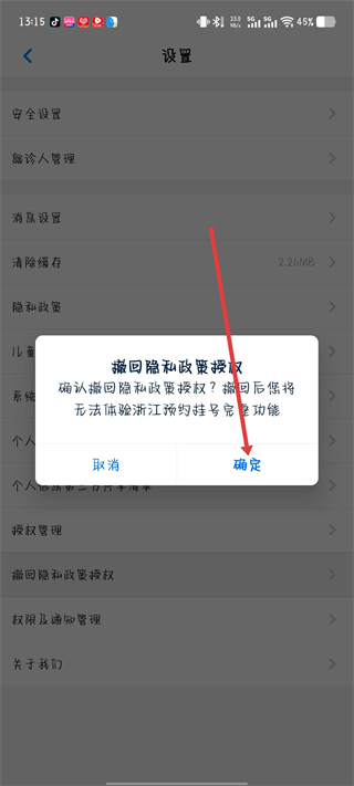 4、在彈出的確認(rèn)撤回隱私政策授權(quán)提示框中點(diǎn)擊確定按鈕。