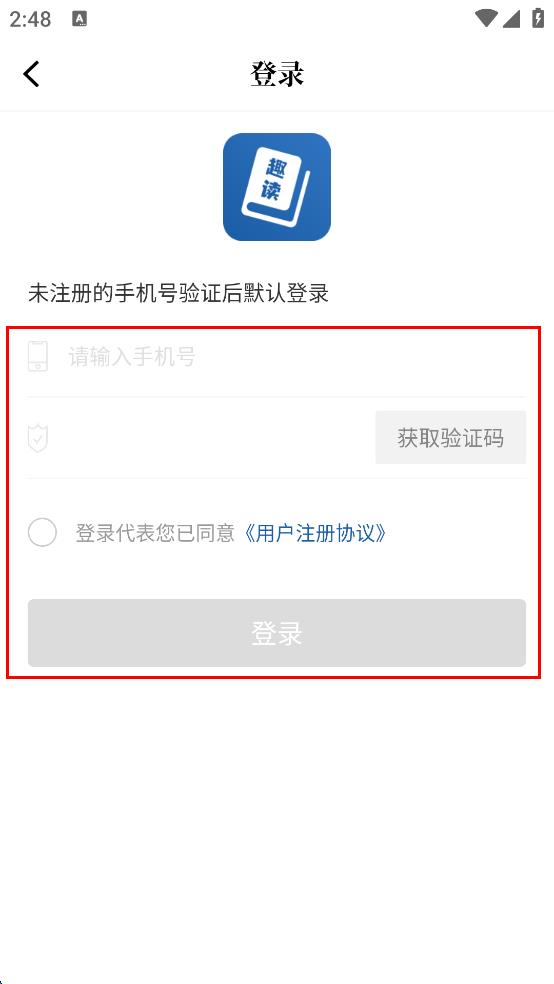 4、在登錄界面,先在輸入框中輸入手機(jī)號碼,接著點(diǎn)擊“獲取驗(yàn)證碼”,收到驗(yàn)證碼后輸入,再勾選登錄代表您已同意用戶注冊協(xié)議,最后點(diǎn)擊“登錄”按鈕完成登錄。