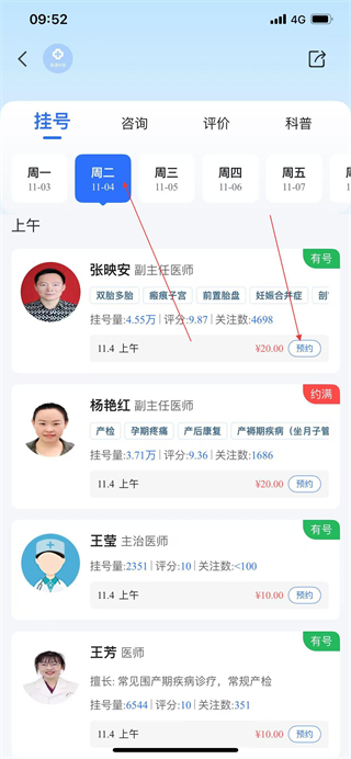 4、在科室頁面選擇掛號日期,并點擊醫(yī)生對應(yīng)的預(yù)約。