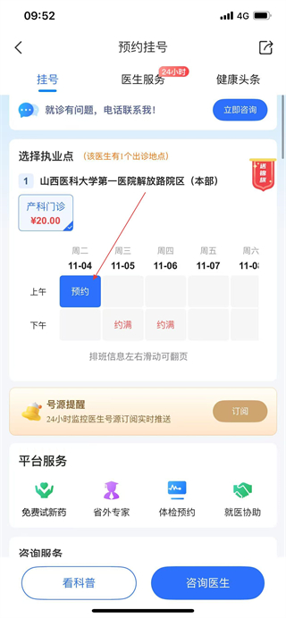 5、在預(yù)約掛號頁面確認執(zhí)業(yè)點和掛號時間后,完成掛號預(yù)約操作。