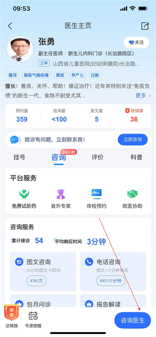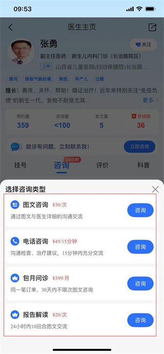 3、在醫(yī)生主頁,點擊咨詢醫(yī)生,彈出選擇咨詢類型的窗口。