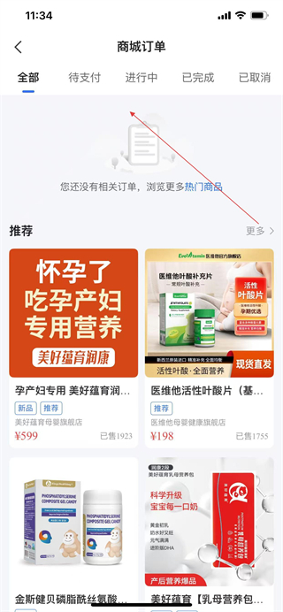 3、進入商城訂單頁面后,即可查看全部、待支付等狀態(tài)的訂單信息。