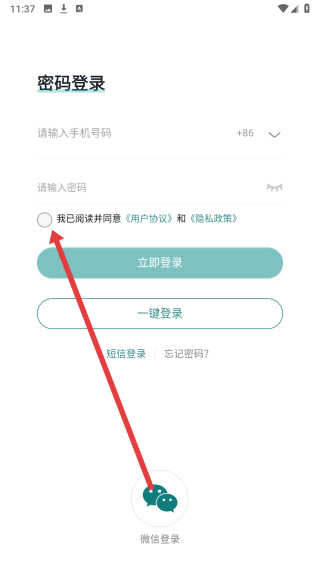 3、在進入到密碼登錄頁面時,在登錄前需勾選我已閱讀并同意按鈕。