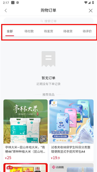 3、進入購物訂單頁面后,可查看全部、待付款、待發(fā)貨、待收貨、待評價等狀態(tài)的訂單。