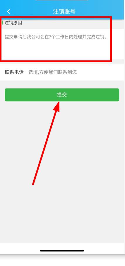 4、進入注銷賬號頁面后,填寫注銷原因,可選擇填寫聯(lián)系電話,之后點擊提交,等待公司在7個工作日內處理完成注銷。