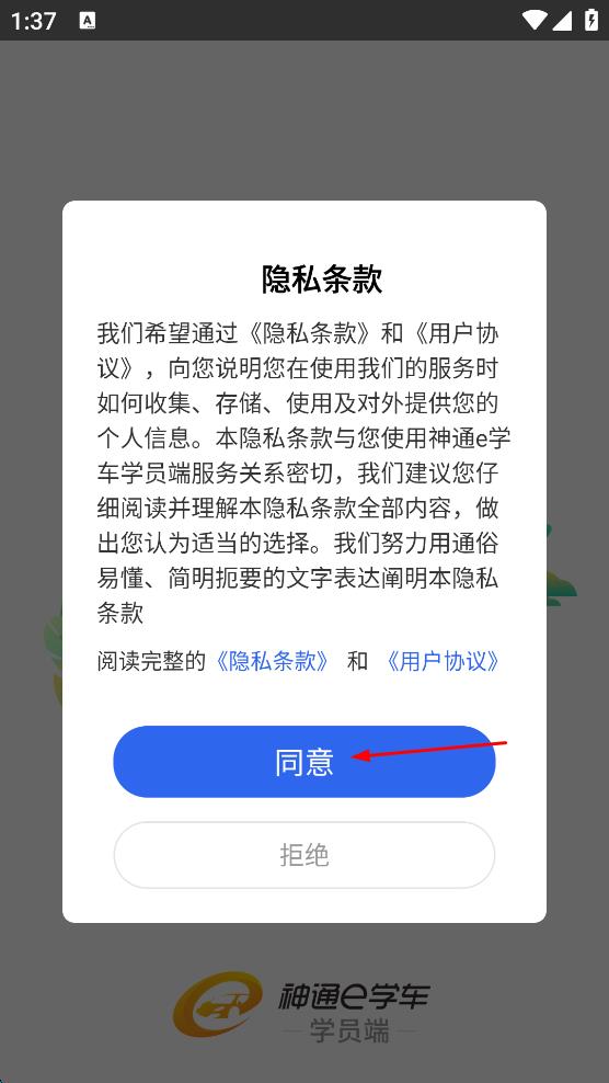 1、打開神通e學車,在彈出的隱私條款提示框中,點擊“同意”,進入登錄頁面。