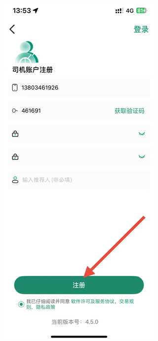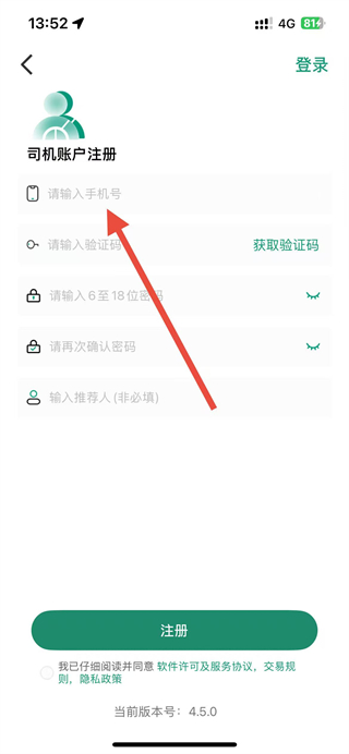 1、在物泊56找貨app登錄頁面點(diǎn)擊司機(jī)注冊(cè)選項(xiàng),進(jìn)入司機(jī)賬戶注冊(cè)頁面。