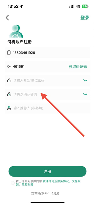 3、在司機(jī)賬戶注冊(cè)頁面輸入密碼并再次確認(rèn)密碼。