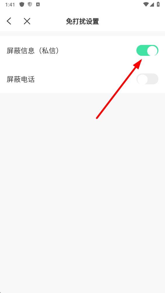 4、在免打擾設(shè)置界面里,找到屏蔽信息選項,點擊其右側(cè)的開關(guān)按鈕,將開關(guān)打開,即可屏蔽消息。