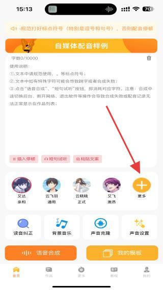 1、打開九錘配音的應(yīng)用軟件,在首頁內(nèi)點(diǎn)擊配音區(qū)域右側(cè)更多的按鈕。