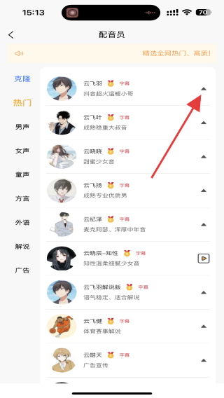 2、進(jìn)入到配音員的頁面內(nèi),點(diǎn)擊配音右側(cè)的圖標(biāo)按鈕。
