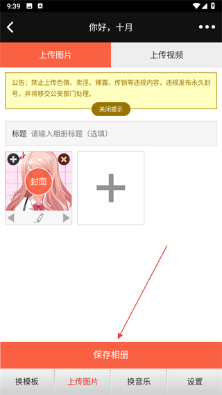 3、在上傳界面,可選擇輸入相冊(cè)標(biāo)題,接著點(diǎn)擊+號(hào)上傳圖片,圖片上傳好后,點(diǎn)擊底部的保存相冊(cè)按鈕。