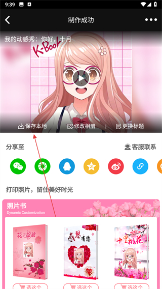 4、等作品制作成功,在制作成功的頁面中,點(diǎn)擊保存本地按鈕,這樣就能把動(dòng)感秀保存到手機(jī)里了。