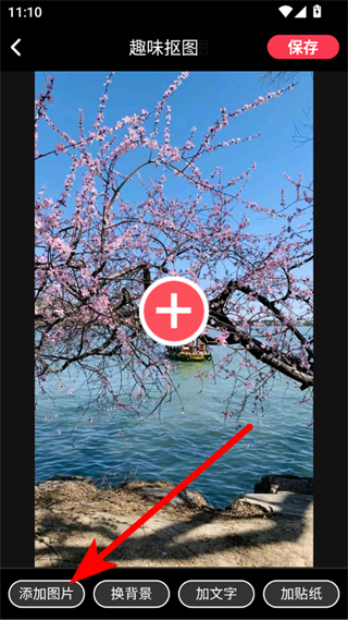 4、摳圖完成后,還可進(jìn)行換背景、加文字、加貼紙等操作,最后點(diǎn)擊保存即可。