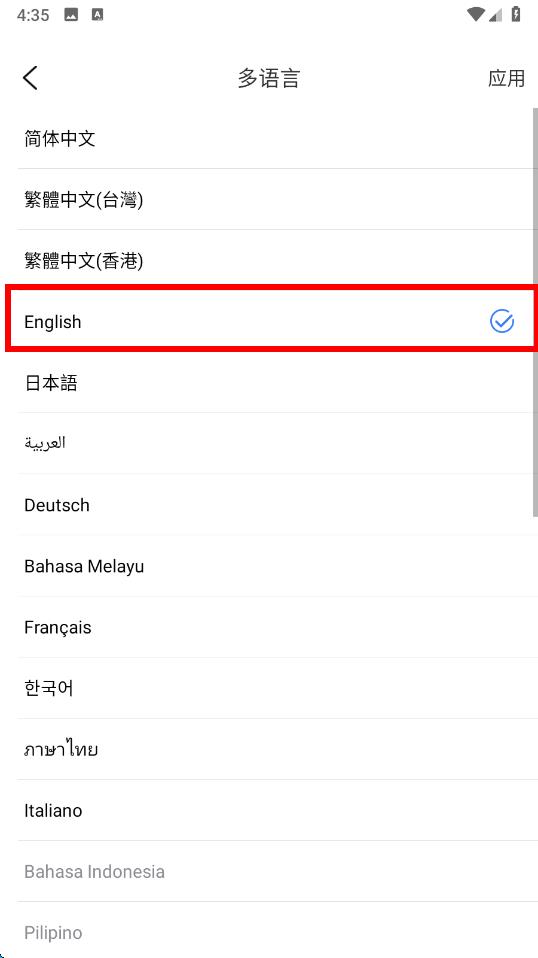 4、點擊想要設(shè)置的語言,如English,勾選后即可將app語言切換為對應(yīng)的語言。