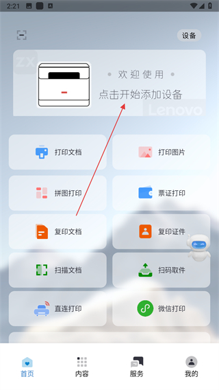 1、打開聯(lián)想至像打印應(yīng)用,點(diǎn)擊頁面中點(diǎn)擊開始添加設(shè)備區(qū)域,進(jìn)入添加打印機(jī)界面。