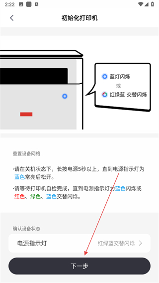4、按照提示操作打印機(jī),查看電源指示燈狀態(tài)并進(jìn)行重置設(shè)備網(wǎng)絡(luò)等操作,點(diǎn)擊下一步。