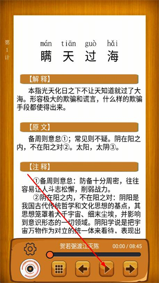 聽故事學(xué)三十六計(jì)軟件手機(jī)最新版是非常好用的文學(xué)知識(shí)學(xué)習(xí)app,提供三十六計(jì)的有聲故事全集,支持播放、暫停、快進(jìn)、慢放等功能,用戶可通過拖動(dòng)進(jìn)度條調(diào)整收聽進(jìn)度,每個(gè)計(jì)策都有詳細(xì)的原文、解釋和注釋版塊,用戶在聽故事的同時(shí)可以閱讀相關(guān)文字內(nèi)容,深入理解三十六計(jì)的內(nèi)涵。