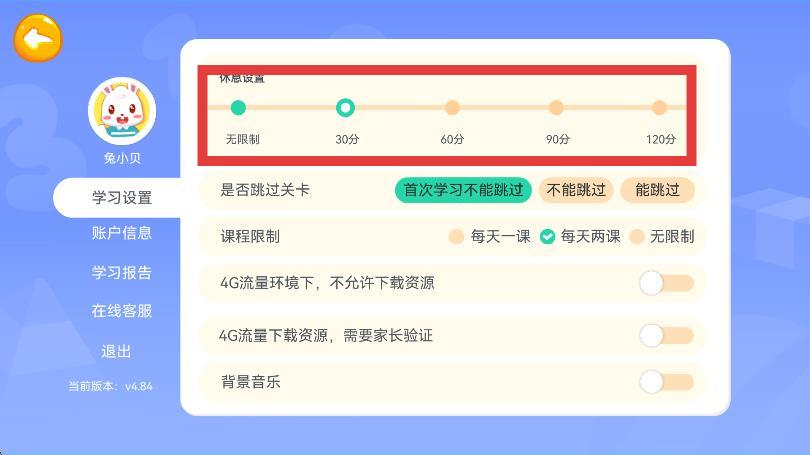 3、休息設(shè)置:默認(rèn)30分鐘后為休息時(shí)間,預(yù)防長時(shí)間造成疲勞,也可根據(jù)情況自定。