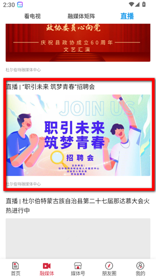 3、在直播列表頁面,選擇目標(biāo)直播如職引未來筑夢(mèng)青春招聘會(huì)直播,進(jìn)入直播播放頁面。