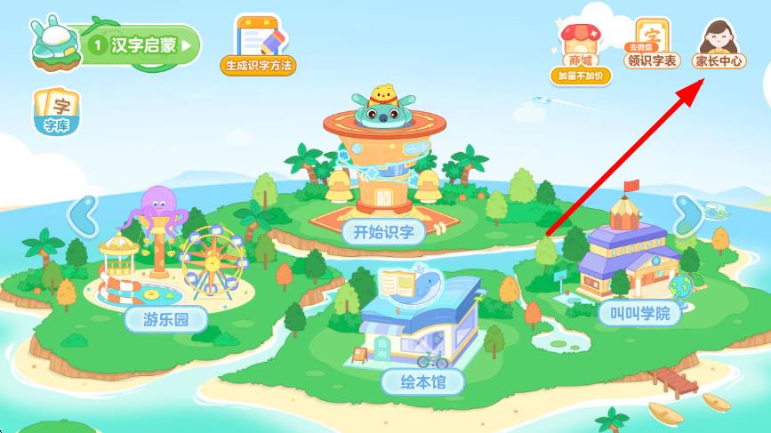1、在手機(jī)上打開叫叫識字后,進(jìn)入頁面,點(diǎn)擊家長中心按鈕。