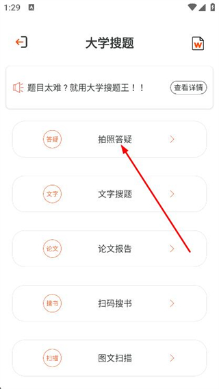 2、在更多功能頁面中,點(diǎn)擊拍照答疑選項(xiàng)。
