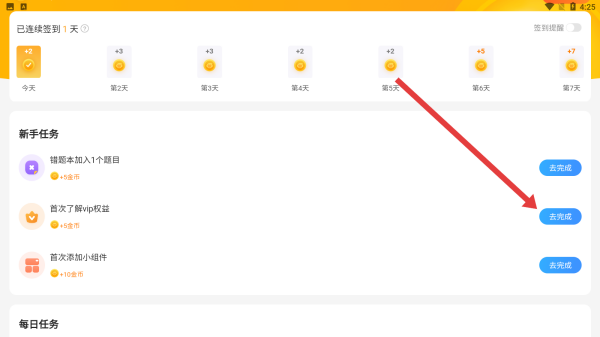 2、進(jìn)入任務(wù)中心后,找到新手任務(wù)里首次了解VIP權(quán)益右側(cè)的去完成按鈕,點擊跳轉(zhuǎn)至VIP權(quán)益詳情頁面,開始瀏覽內(nèi)容。