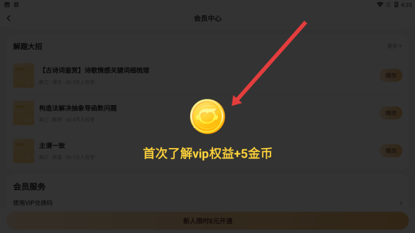 3、在VIP權(quán)益詳情頁面瀏覽完畢后,系統(tǒng)自動發(fā)放首次了解VIP權(quán)益+5金幣獎勵,成功完成該任務(wù),積累金幣用于后續(xù)使用。