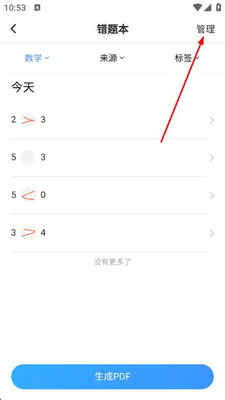3、進(jìn)入學(xué)科錯題本頁面后,點擊右上角的管理。