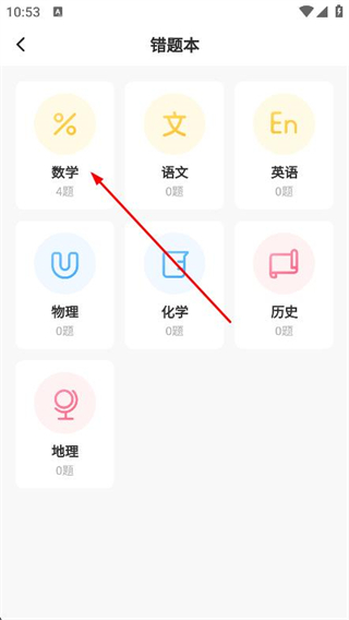 2、在錯題本頁面,點擊需要刪除記錄的學(xué)科。