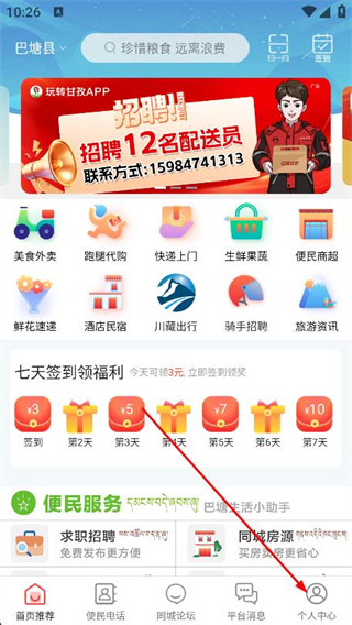 1、打開玩轉(zhuǎn)甘孜,點(diǎn)擊底部導(dǎo)航欄個(gè)人中心選項(xiàng)。