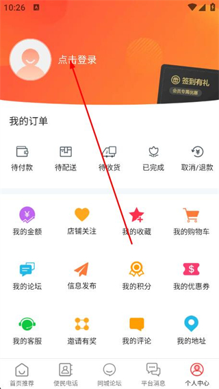 2、在個(gè)人中心頁面中,找到并點(diǎn)擊點(diǎn)擊登錄區(qū)域。