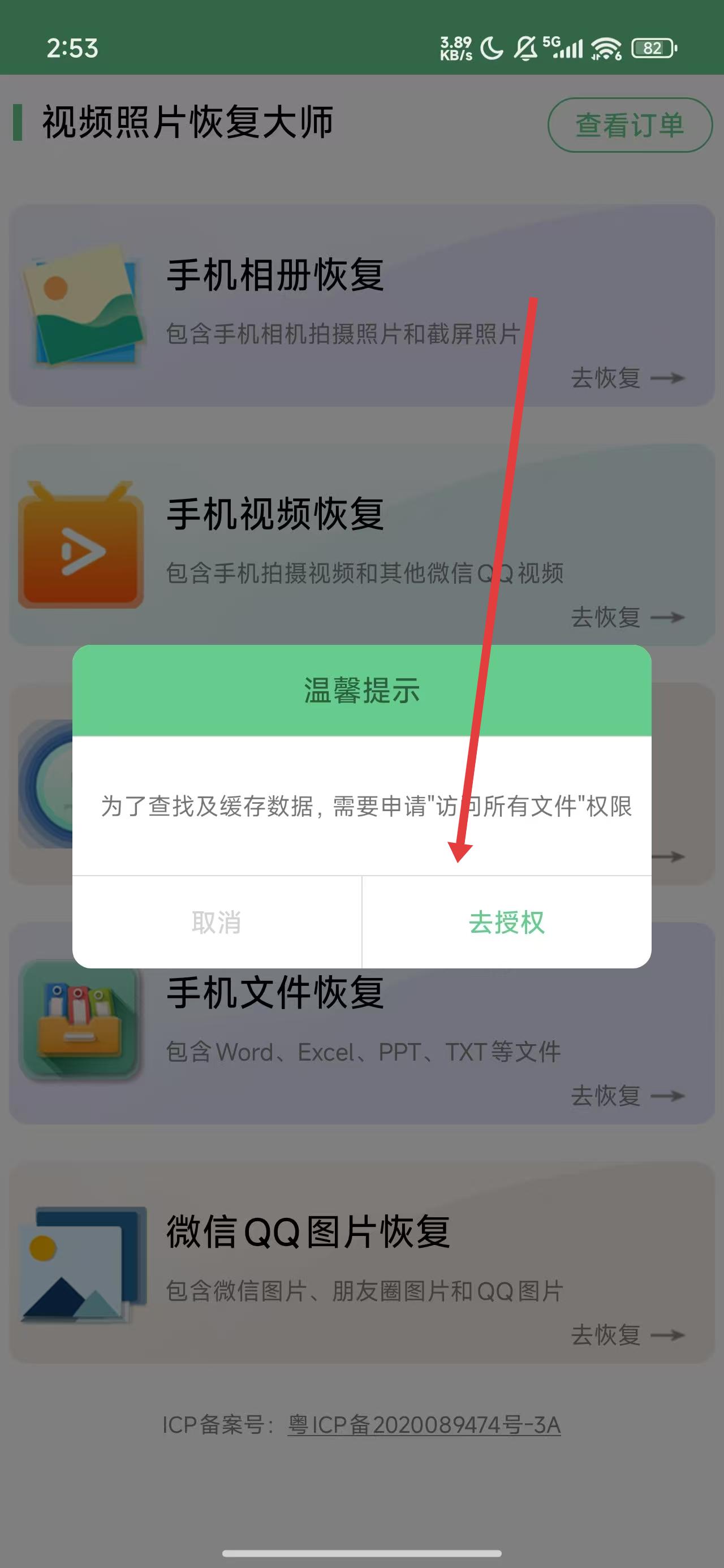 2、在出現(xiàn)的彈窗中,點擊去授權按鈕,授權后即可開始進行恢復操作。
