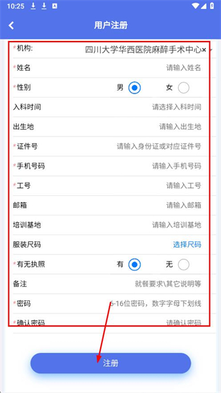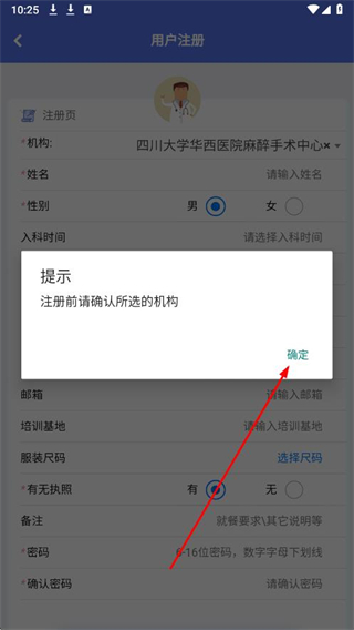 3、填寫注冊(cè)信息,選擇服裝尺碼,設(shè)置密碼并確認(rèn)密碼,點(diǎn)擊注冊(cè),完成醫(yī)師注冊(cè)流程。