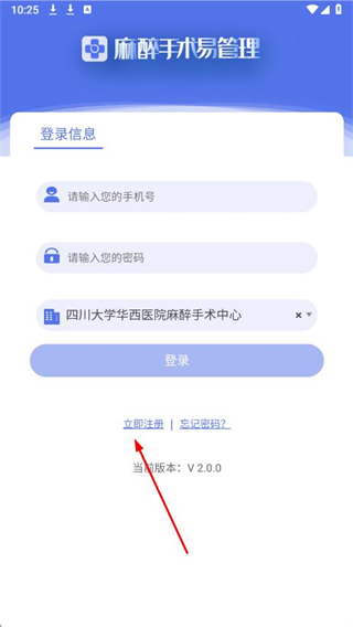 1、打開麻醉手術(shù)易管理APP,在登錄頁面點(diǎn)擊立即注冊(cè)。