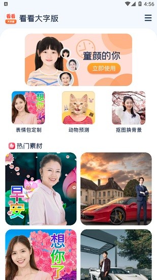 看看大字版是一款適用于老年人的手機應用。主要提供在線拍照、表情包制作以及照片編輯等服務功能??梢栽谑謾C上輕松處理照片,體驗智能化的人工ai摳圖功能。讓中老年人朋友也可以輕輕松松體驗潮流玩法。馬上來下載安裝吧!