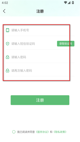 3、在注冊信息填寫頁面,依次輸入手機號,點擊獲取驗證碼并輸入,設置密碼后再次輸入密碼確認。